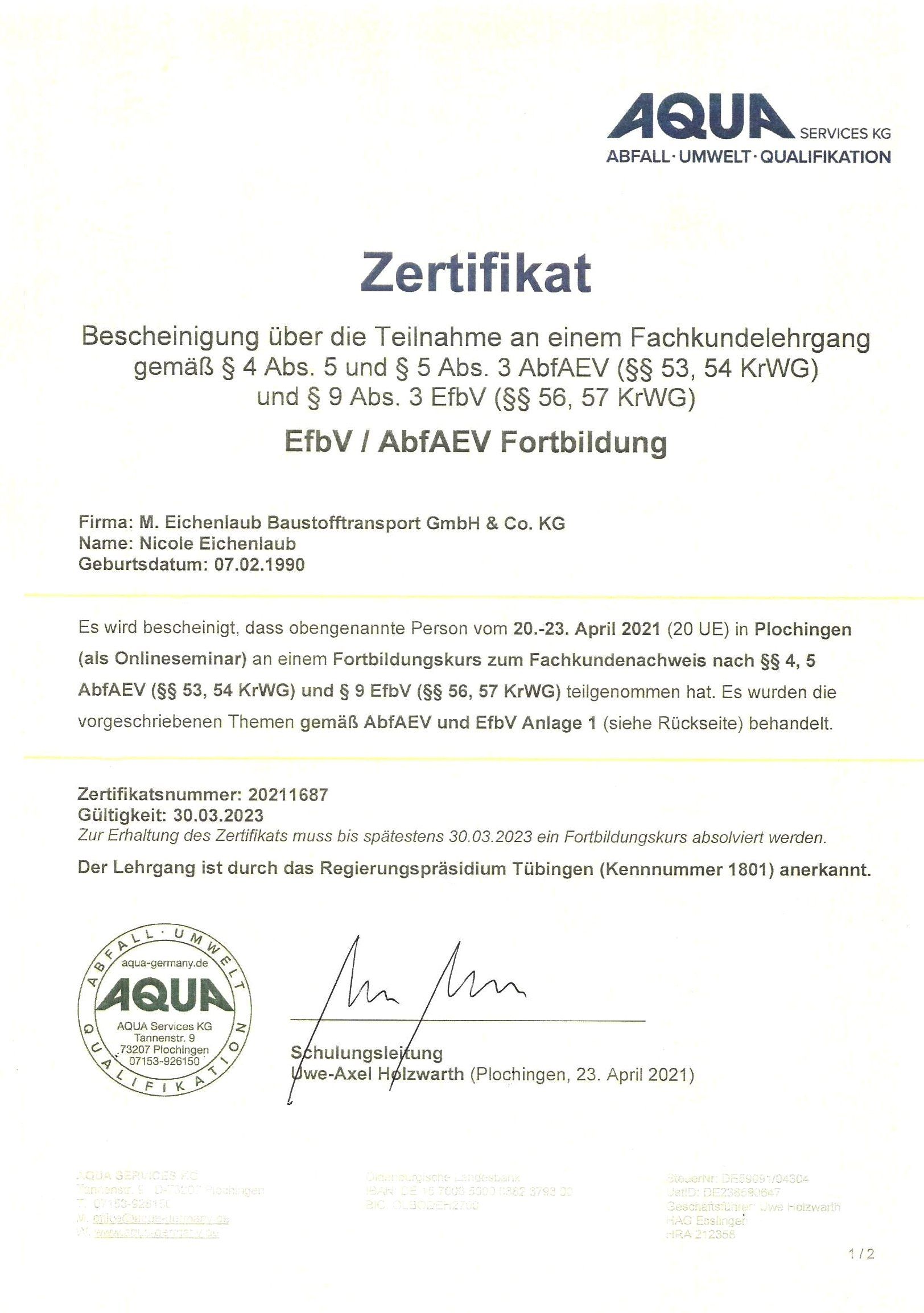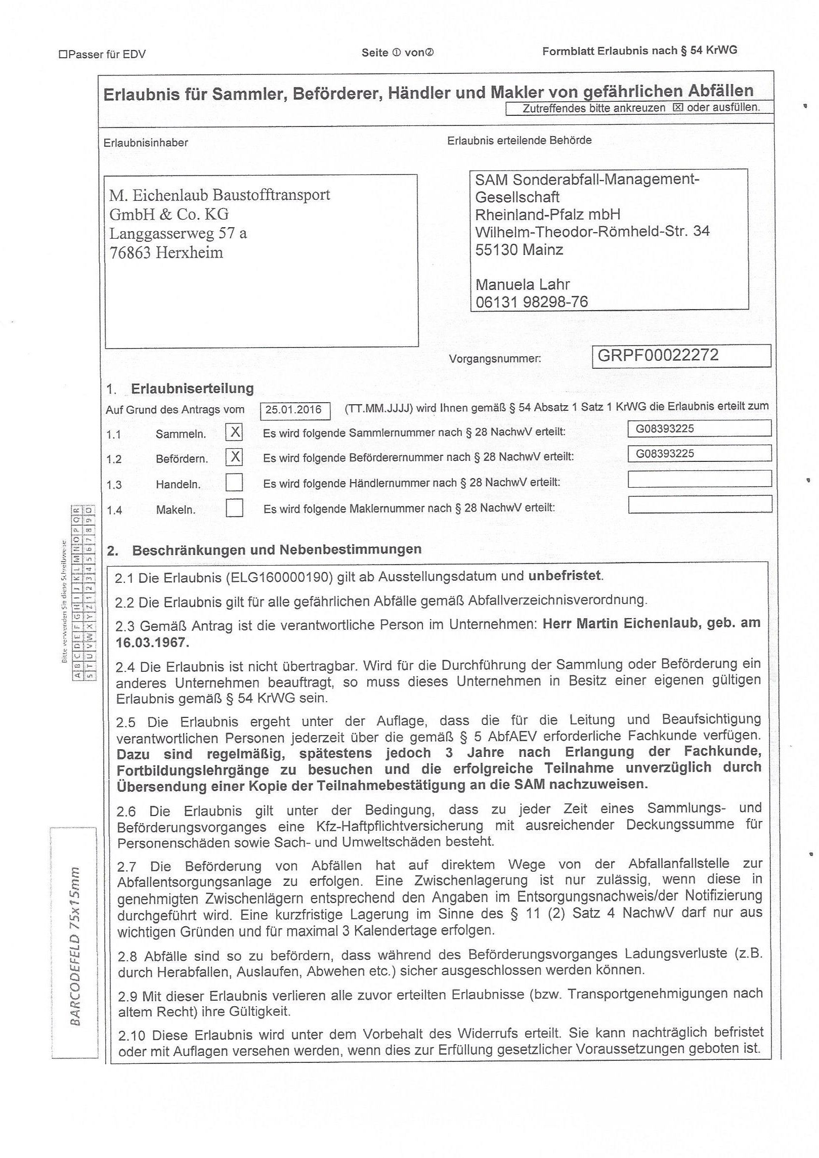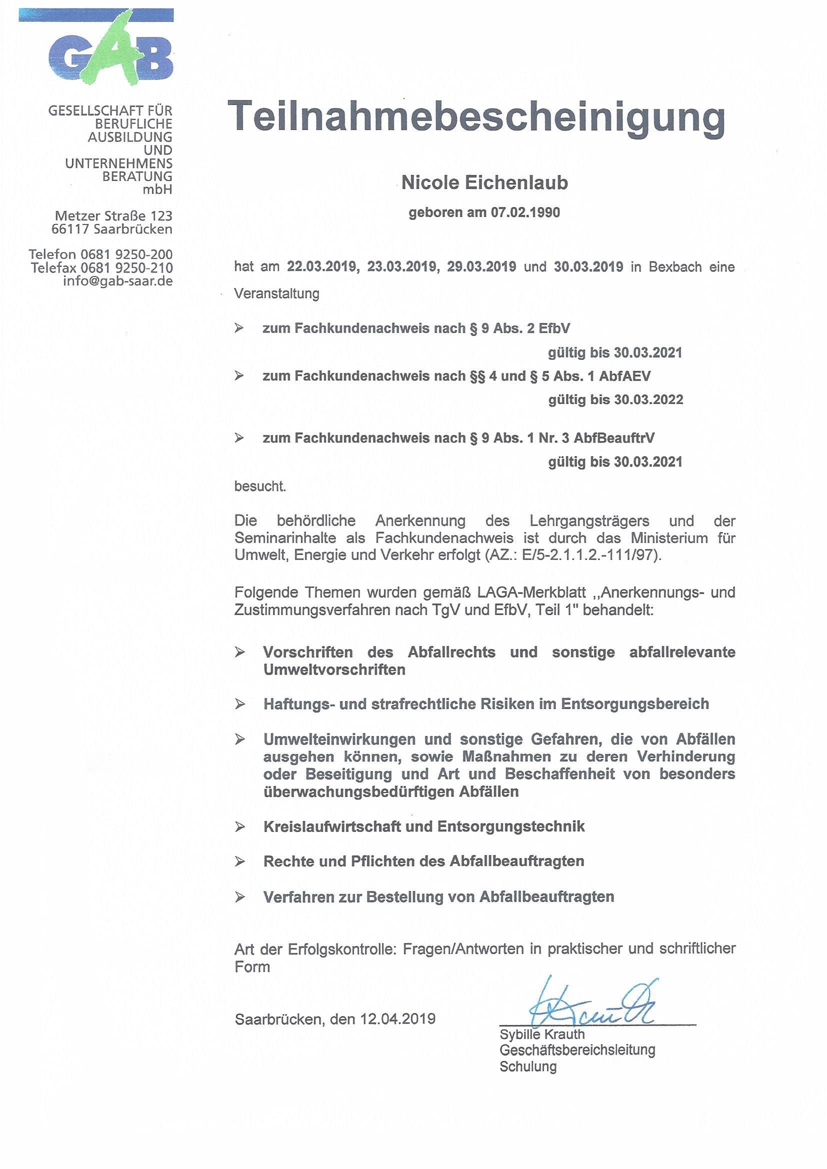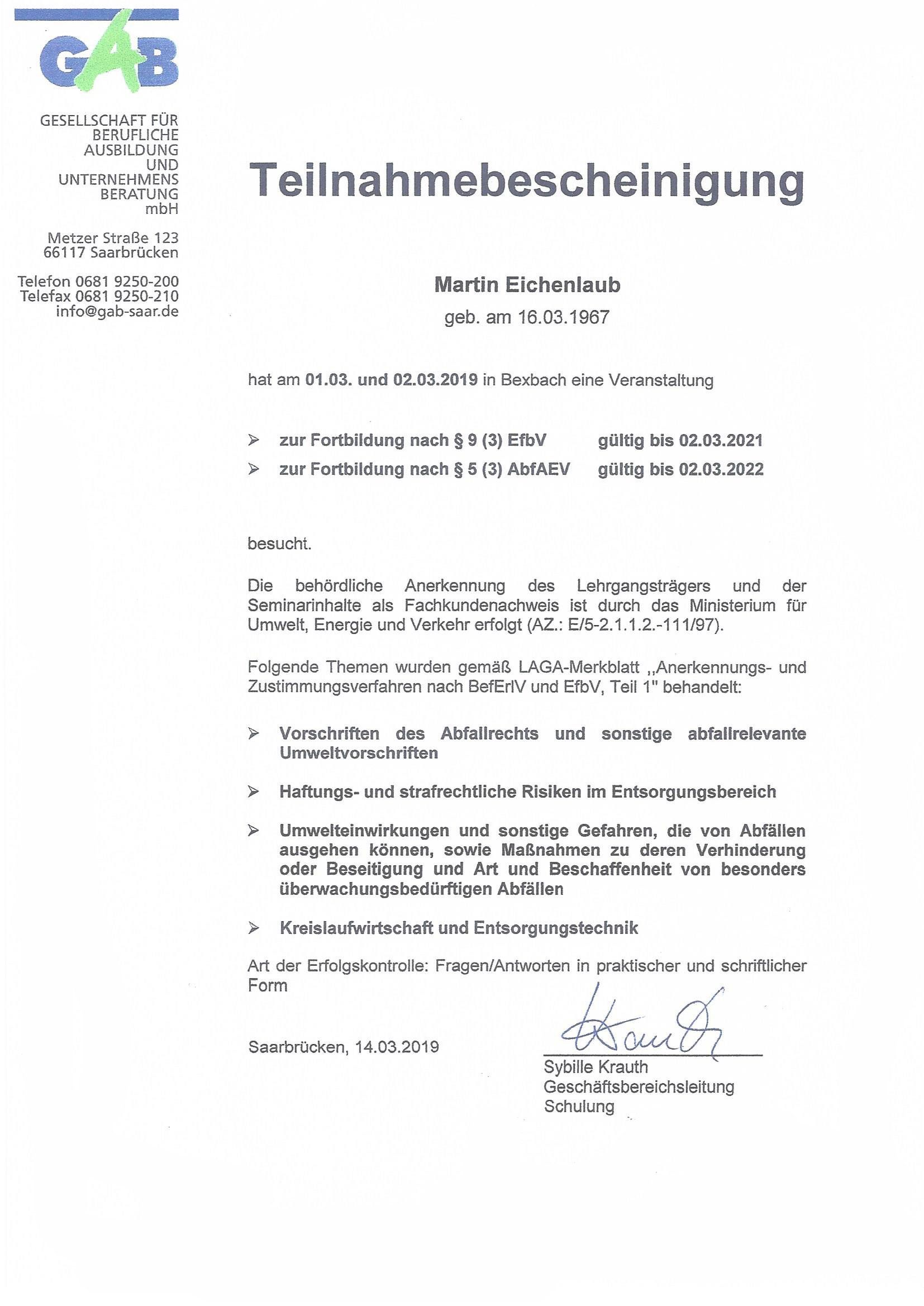 Als Unternehmen in der Entsorgungsbranche müssen wir einen sachgemäßen Umgang mit den zu entsorgenden Stoffen sicherstellen. Diese Verpflichtung sind wir dem Schutz der Umwelt und unseren Kunden und Mitarbeitern schuldig. So ist es erforderlich, sich stetig weiter zu bilden und den sich wandelnden Herausforderungen zu stellen. Sehen Sie im folgenden die zahlreichen Nachweise der Zertifizierung von Transport und Entsorgung.